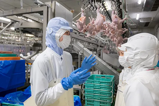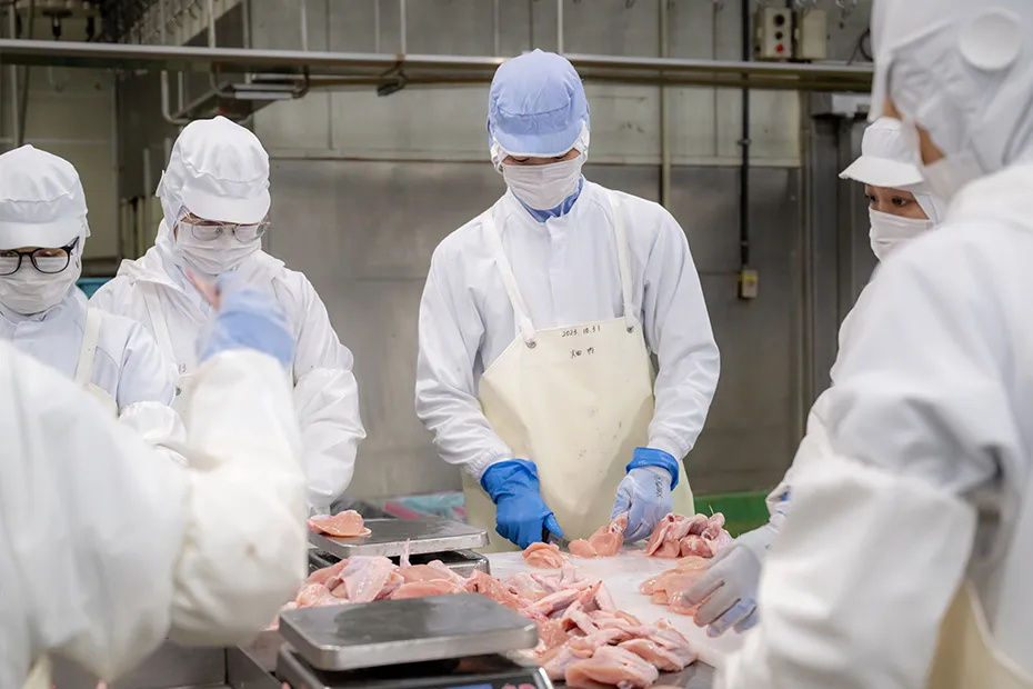 高校の先輩が当社の鶏を飼育している農場で働いていて、高品質な鶏肉を提供するために生産段階からこだわっている会社だという話を就職活動の時に聞いて興味を持ち、採用試験を受けました。入社後に配属されたのは、胸肉やもも肉手羽先などの製品を製造する部門でした。最新の機械を備え、1日平均で6万羽を超える鶏を処理している大きな工場です。私の持ち場では、手作業で解体する仕事を担当しました。最初の頃は、大勢のスタッフが整然と製造ラインに並び、包丁を片手に黙々と作業している光景に圧倒されました。
