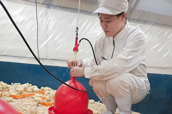私の主な仕事は、黄色いヒヨコが白い親鶏となり、卵を産めるようになるまでの育成期(6カ月間)の飼育管理です。毎日の給餌はもちろん、ワクチン投与、検査のための採血、鶏舎の温度管理などをしながら、健康な種鶏を育てています。