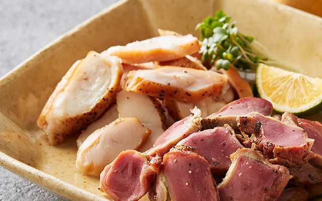 ハムのようにさっぱりとした胸肉の燻製と、ベーコンのようにコクのあるもも肉の燻製をセットにしました。