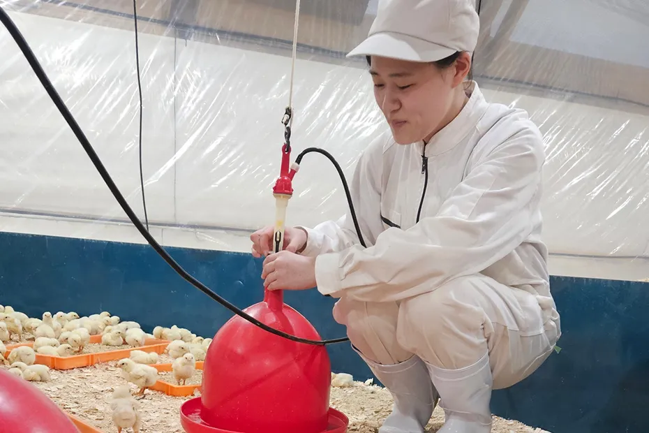 私の主な仕事は、黄色いヒヨコが白い親鶏となり、卵を産めるようになるまでの育成期(6カ月間)の飼育管理です。毎日の給餌はもちろん、ワクチン投与、検査のための採血、鶏舎の温度管理などをしながら、健康な種鶏を育てています。